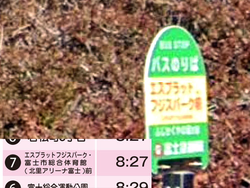 現地のバス停標には「エスプラットフジスパーク前」としか書かれていないようです。エスプラットフジスパークはホテル併設の複合型スポーツ施設とのこと。富士市には比較的長い名前のバス停が多いです。乗換案内のNavitimeは省略形で掲載しています。 |