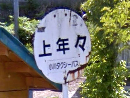 「年」の字が重なる珍しいバス停名です。「年々」が公的住所になっています。また、この場所を由来とする「年々」が名字になっているとのこと。「開墾地が年々耕作をくりかえすことに由来する」(名字由来net)。他に、下年々、年々橋バス停があります。 GoogleStreetView |